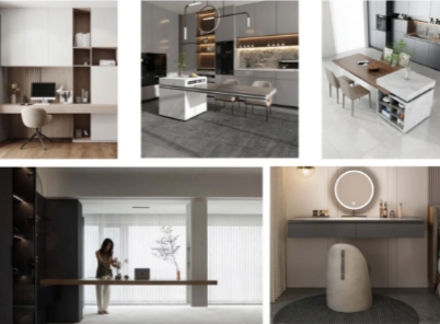 懸空的桌板或者薄柜可以當做書桌或梳妝臺使用沒有桌腿的設計減輕了對地面的壓迫,視覺上更加輕盈靈活,也更具高級感。
