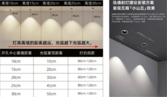 射燈離墻距離過近時(shí),會(huì)過曝光,正常情況下離墻15-30cm最佳,就可以均勻洗墻。