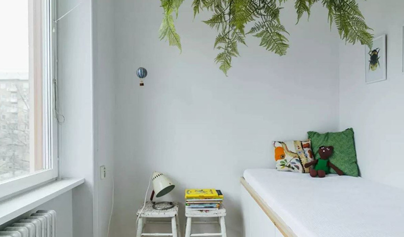 客臥布置簡單,只有一張單人床(更像是柜子拼成的床)和兩把凳子(做床頭柜)。吊起的文竹,是一個特色。
