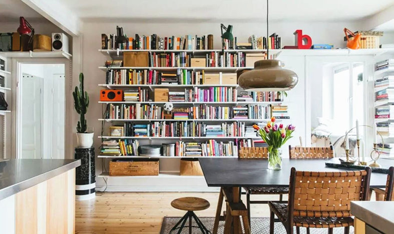 從廚房看向書架,整面的書架是最好的展示和收納區(qū)域,各種書籍和裝飾交錯擺放。