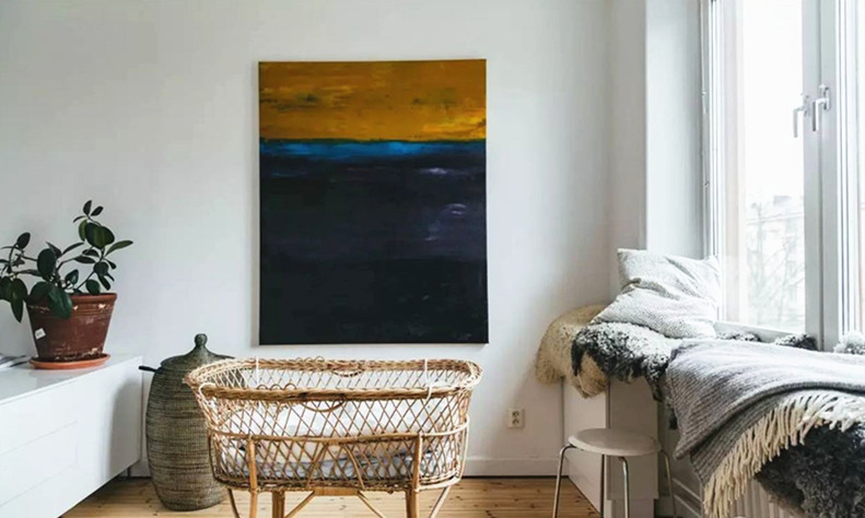 主臥準備的嬰兒床,放在靠近窗戶的位置。大幅的裝飾畫,讓這處充滿藝術(shù)氣息。