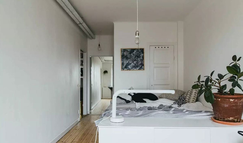 床與嬰兒床之間,利用柜子做了簡單的隔斷。頂部的管道,只做了簡單的包裹處理。